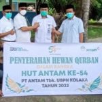 FOKUSKATANEWS.COM.KOLAKA- PT Antam UBPN Kolaka menyerahkan dua ekor sapi qurban kepada Pemerintah Daerah Kabupaten Kolaka, bertempat di halaman masjid Agung Khaera Ummah