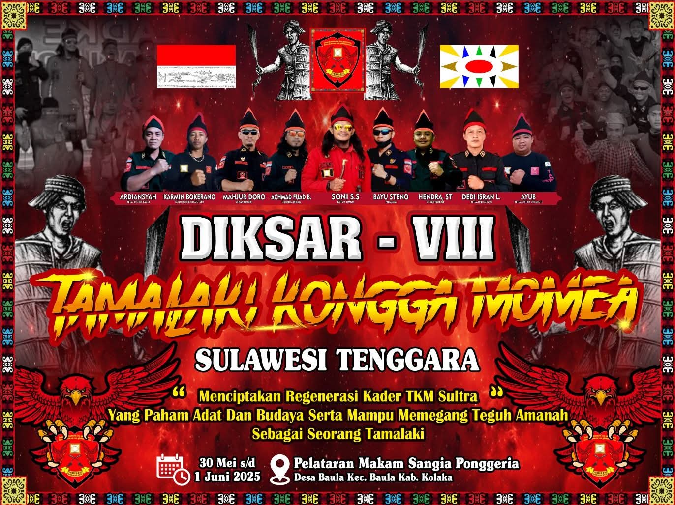 Tamalaki Kongga Momea (TKM) Sulawesi Tenggara (Sultra),sukses menggelar Pendidikan dan Latihan Dasar (Diksar) ke-VIII yang dilaksanakan selama tiga hari sejak Jum’at 30 Mei hingga Minggu 1 Juni 2025, bertempat di kompleks Makam Sangia Ponggeria di Desa Baula Kecamatan Baula, Kabupaten Kolaka, pada jumat (1/6/2025).