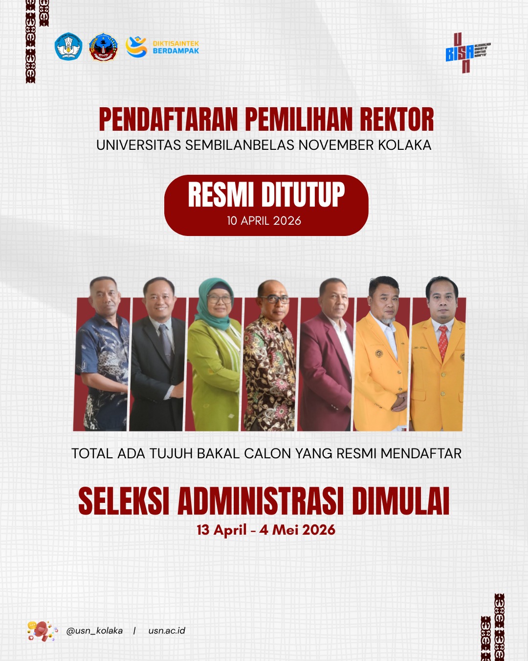 Kini, bola berada di tangan panitia untuk proses verifikasi. Publik kampus dan masyarakat Sulawesi Tenggara pun menanti dengan antusias, siapa sajakah yang akan lolos dari lubang jarum administrasi untuk memperebutkan kursi nomor satu di USN Kolaka.