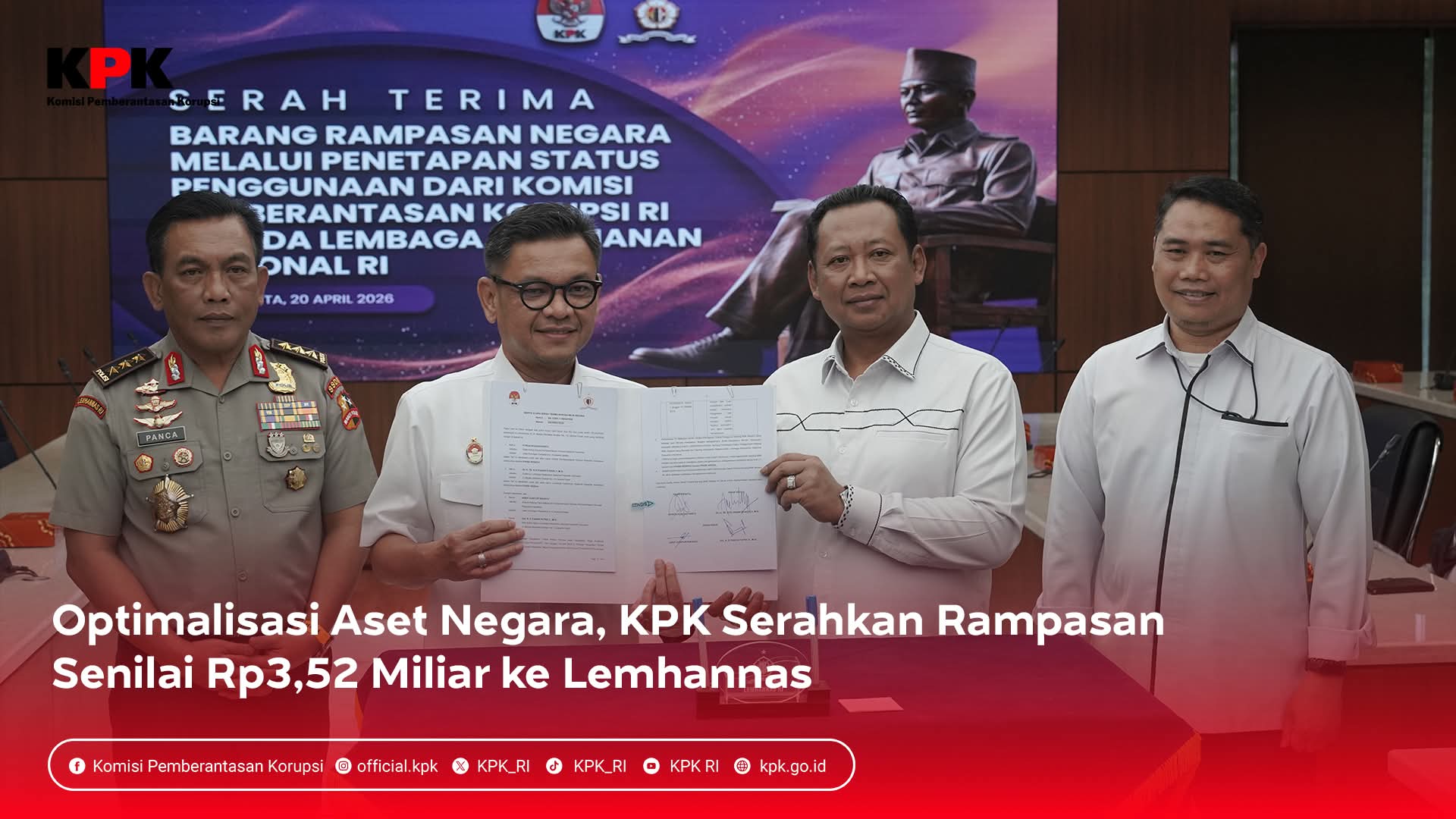 Komisi Pemberantasan Korupsi (KPK) Republik Indonesia menyerahkan barang rampasan negara senilai Rp3,52 miliar kepada Lembaga Ketahanan Nasional (Lemhannas). Langkah merupakan bagian dari strategi memaksimalkan dampak ekonomi dan pencegahan korupsi. Senin (20/4/2026).